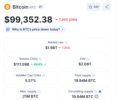 2025-11-05米兰体育,米兰体育官方网站,米兰体育APP下载据CoinMarketCap平台报价,北京时间11月5日9时44分,比特币价格跌破10万美元,报99352.38美元,24小时跌幅超过7%。