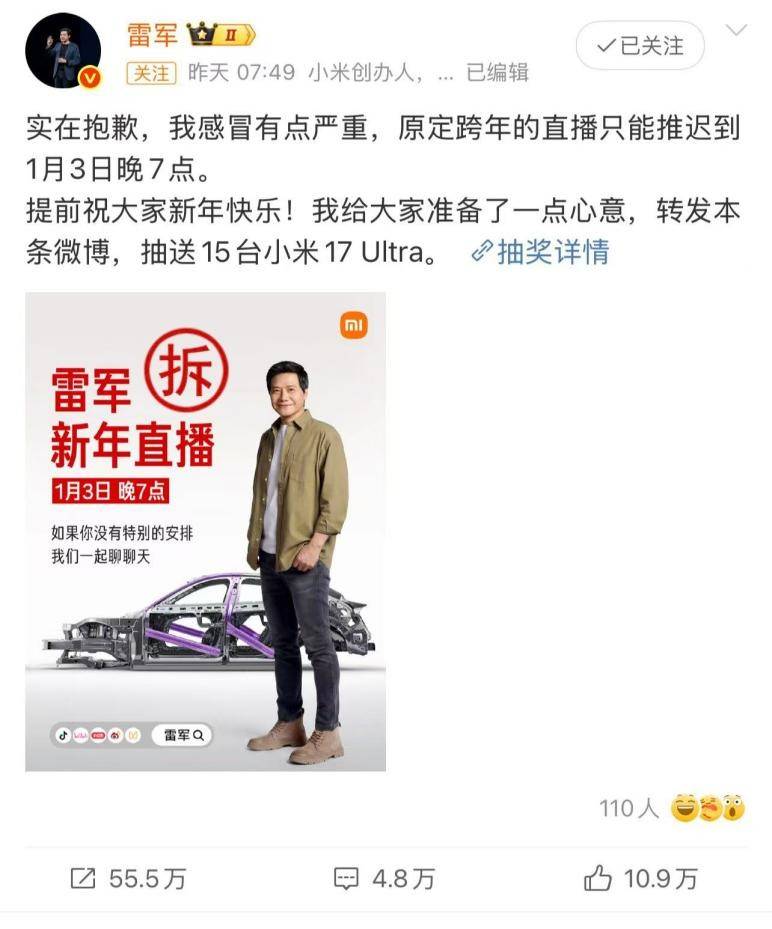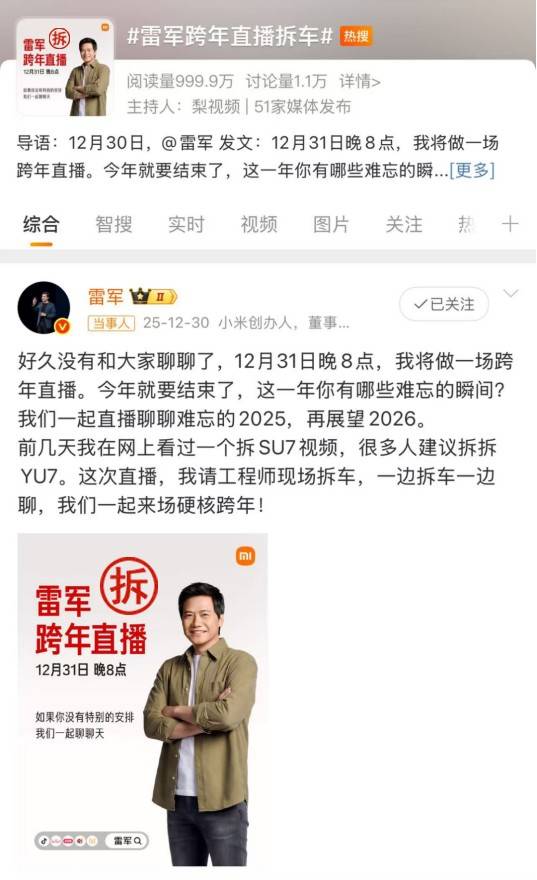 做为中国的“雷布斯”,雷军宣布12月31日跨年夜直播。这一次,他没有发布新品,没有讲宏大叙事,而是请工程师“现场拆车”。听我说,他要全网直播拆车。