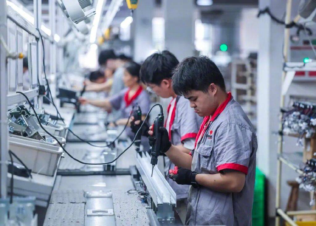 位于金华市金义新区的浙江好易点智能科技有限公司数字化车间,工人在流水线上加工产品/新华社记者徐昱 摄