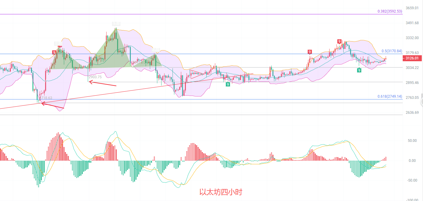 四小时K线,MACD连续放量增筹,多头在3100附近站稳脚跟以后有很大概率拉伸继续北上,DIF和DEA形成金叉,布林带收缩以后上轨3124失守,K线三连阳形成的多头趋势比较强势,短线趋势的盘口走北,暂时谨慎南下,没有上车的币友可以等等看有没有北上的机会