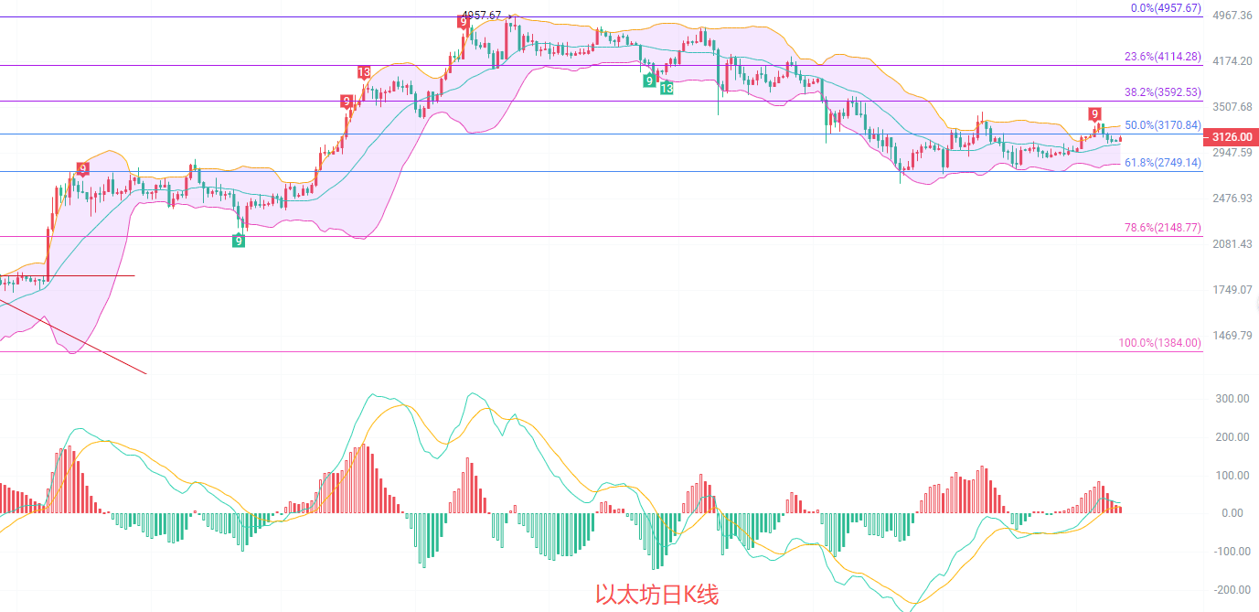 以太坊现价3130,现在是北京时间凌晨三点四十,以太坊日K线,EMA趋势指标整体处于收缩阶段,也就是说底部支撑有效可以北上,短线一线的分割线阻力点,MACD连续放量减少,DIF和DEA迟迟没有拉伸,说明盘口的量能不足,南北趋于平衡,布林带中规3050支撑有效,上轨关注3268,