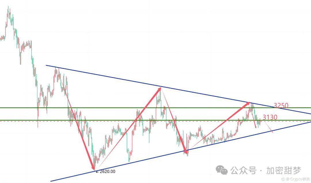 ETH当前小级别已经出现止跌信号,短期至少会走一段反弹行情,3130是这波震荡行情分水岭,右侧突破企稳追多,看3212减仓,因为这里是这波行情的618位置,突破3130再跌破顺势做空,3060和3000均是有效支撑。