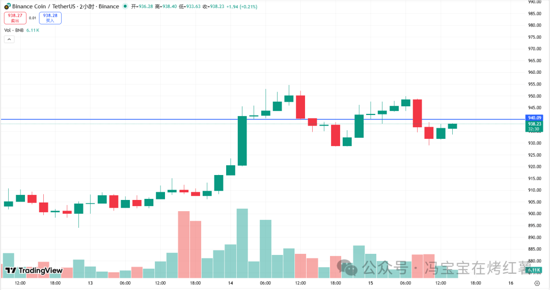 bnb今日关键位940,若收于940上方,回调有望结束并转向上行,压力关注955、970、985附近。