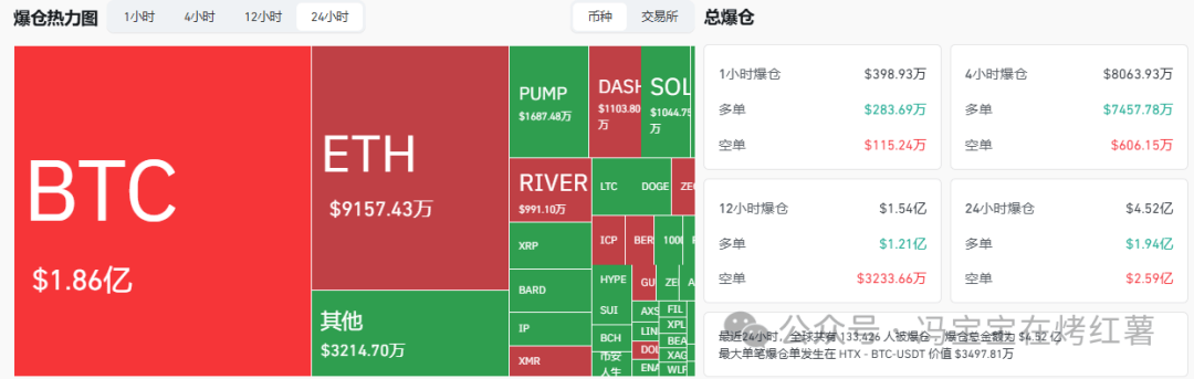 过去24小时全网共有133,426人被被爆仓,爆仓总金额为$4.52亿美元,多单爆仓1.94亿美元,空单爆仓2.59亿美元。