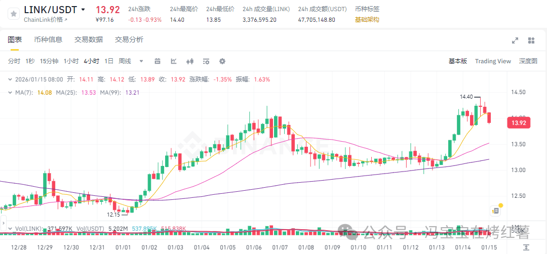 好多人问LINK,这是主流币,波动小风险低,稳得很。风险收益本就成正比。技术面看,短线。关键是ONDO、PLUME这些热门RWA案例,底层都离不开LINK的预言机。