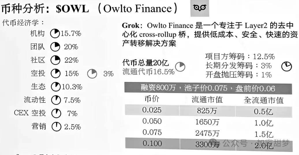 总量 20 亿,初始流通 16.5%,盘前价 0.06,池子价 0.075,总融资:不少于 800 万,分配代币 15.67%,机构最高成本币价为 0.075