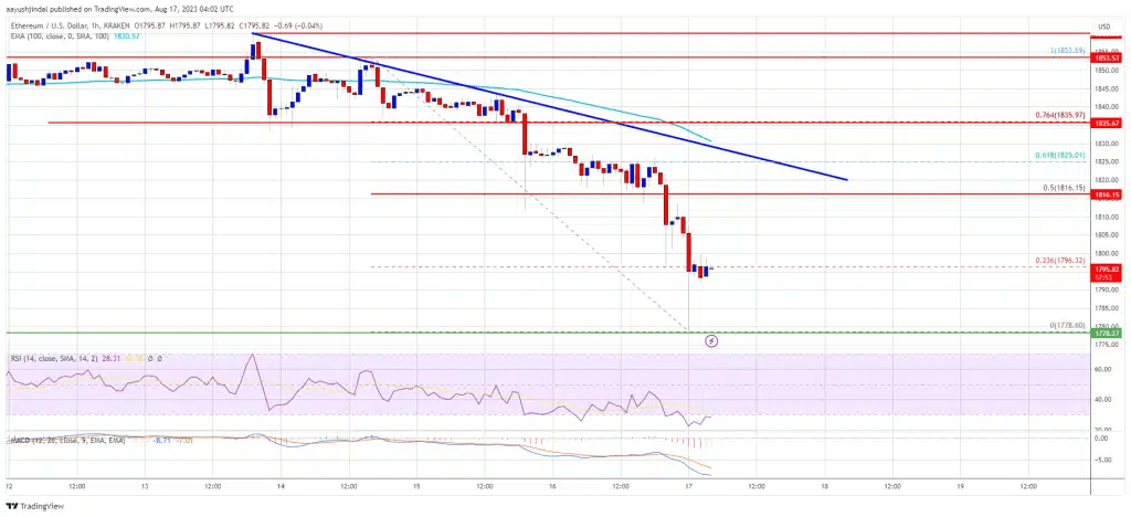 在过去的几周里,以太坊一直未能突破 1,850 美元的水平,这一直是加密货币的强大阻力。它一直处于看跌区域,并已跌破 1,820 美元水平。