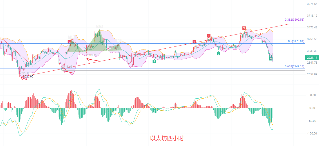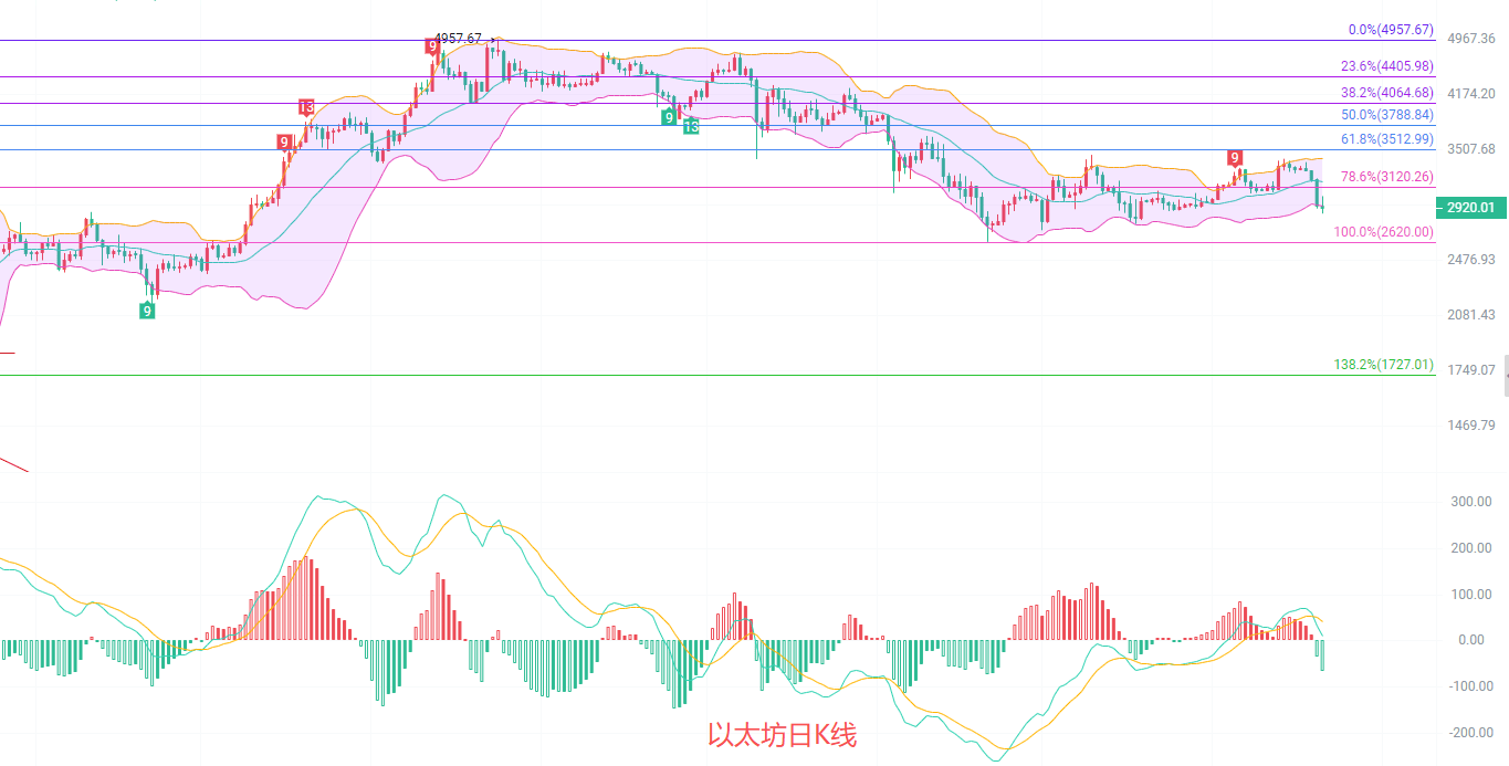 日K线,EMA趋势指标向下收缩,EMA15和30回到了,黄金分割线,MACD连续缩量走低,DIF和DEA开始从0轴线上方向下冲击,布林带下轨2933失守,预计短线会回到通道内然后继续走南,