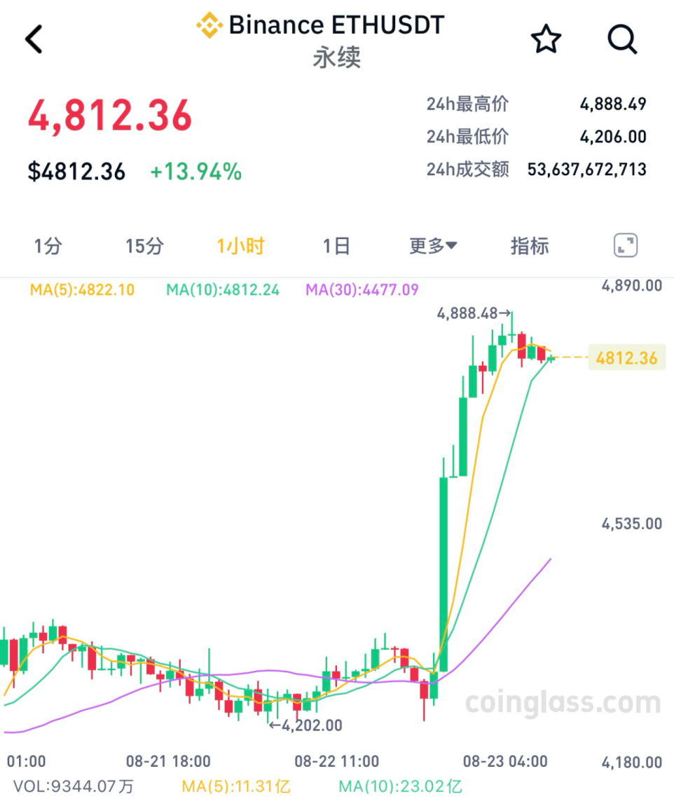 8月23日凌晨,以太坊强势拉升至4888.48美元,突破2021年11月初创下的历史最高价4878美元,再创历史新高。