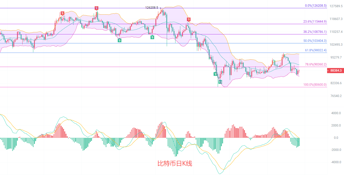 日K线,EMA南下趋势不变,EMA15已经抵达了9万关口,跌破了0.786一线,MACD依旧是缩量阶段,DIF和DEA向下扩散不变,布林带下轨已经抵达了85500,还在进一步走低,K线附近,下方支撑下移上方压力也在下移,这个时候回调并不是北上而是南下的机会