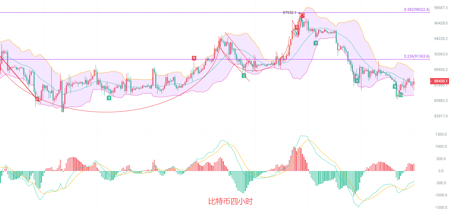 四小时K线来回试探,高点虚破EMA30趋势线一线,连续向下试探,布林带向下扩散,下轨关注86600,上轨89670,MACD放量减少DIF和DEA在0轴线下方扩散,整体趋势上南下很明显,不需要怀疑太多,盘前计划好盘中安心交易即可