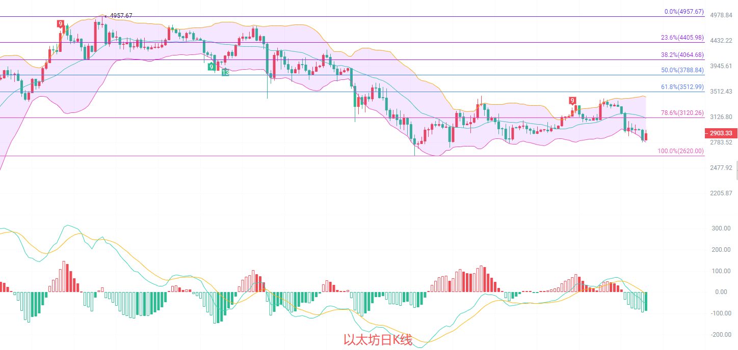 日K线,EMA趋势指标向下扩散空势不变,EMA15已经抵达了3030,MACD连续缩量,DIF和DEA跌入0轴线还有一段距离,短线北上的币友可以在主力冲击3000关口的时候减持,没有北上的等机会南下