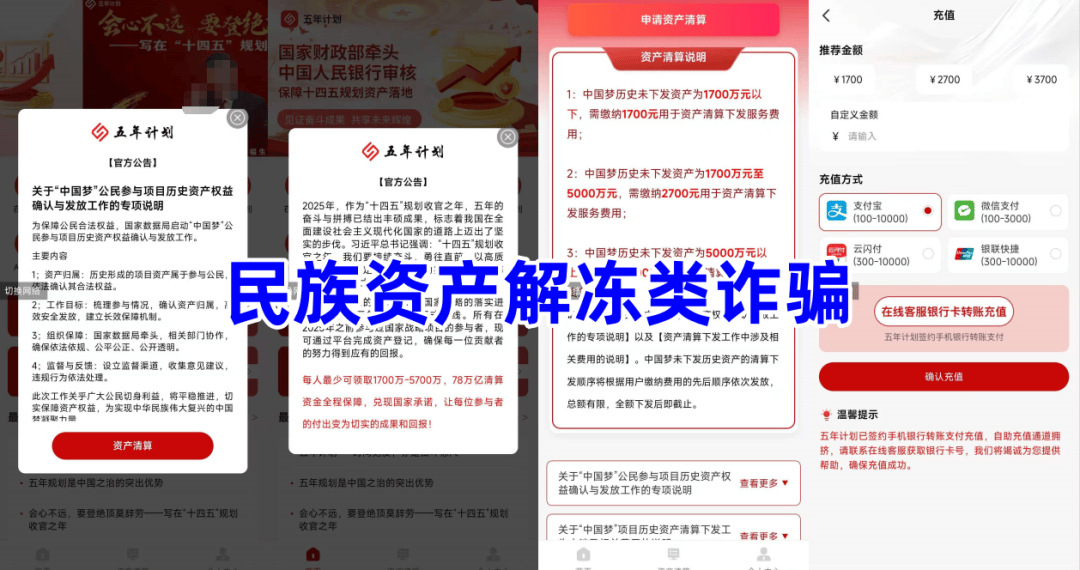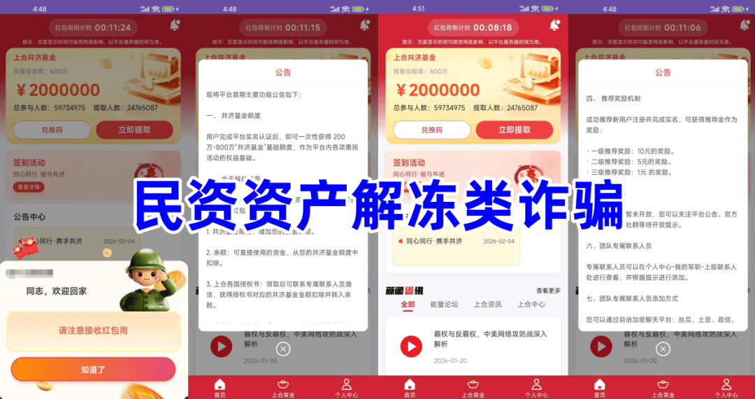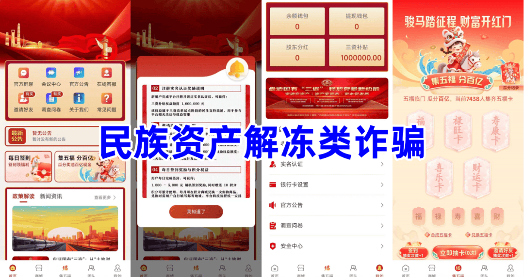 不法分子冒充“某部门”的旗号,打着“十五五规划 · 三资改革”的名义,声称十五五将沉睡资金转化为可用资金,发放新年红包及 1.93 万亿三资补贴资金,参与者实名注册可获得不少于100万美元的三资补贴资金,每天签到、邀请新人参与,可领取补贴金,还有实物产品领取等。