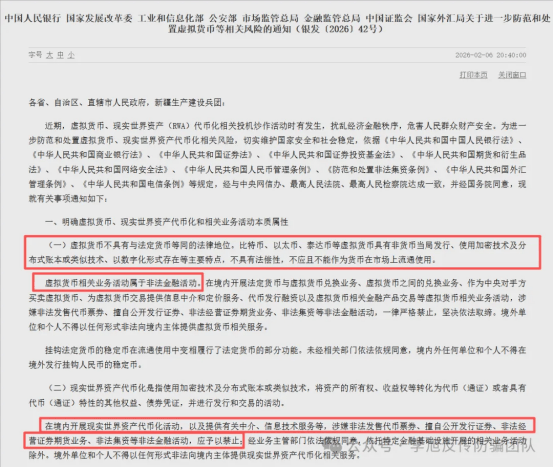 2026年2月6日,央行、证监会等八部门联合发布关于虚拟货币RWA(真实世界资产代币化)的重磅通知。