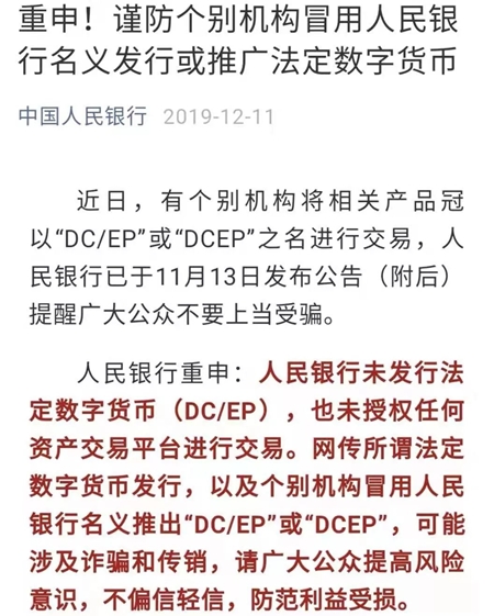 12月11日,央行官微发布消息称,近日,有个别机构将相关产品冠以“DC/EP”或“DCEP”之名进行交易,人民银行已于11月13日发布公告提醒广大公众不要上当受骗。人民银行重申:人民银行未发行法定数字货币(DC/EP),也未授权任何资产交易平台进行交易。网传所谓法定数字货币发行,以及个别机构冒用人民银行名义推出“DC/EP”或“DCEP”,可能涉及诈骗和传销,请广大公众提高风险意识,不偏信轻信,防范利益受损。