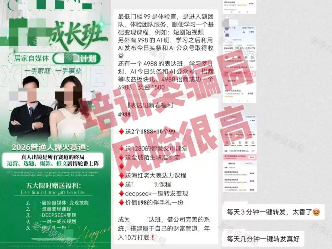 此类骗局大多利用“AI写作”、“轻松副业”等热门话题作为诱饵,在社交平台精准投放,吸引目标主动上钩,一步一步引导学员购买高价课程甚至为了获得佣金主动拉拢新人。