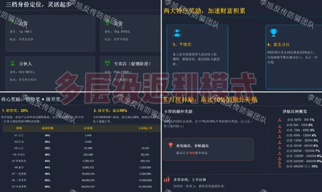模式方面,参与者需以198元/盒的价格购买,设置会员、金卡、合伙人、专卖店四个档位加盟门槛,靠拉人头发展下线,按团队业绩发放级差奖、平级奖、股东分红及月度补贴等等。