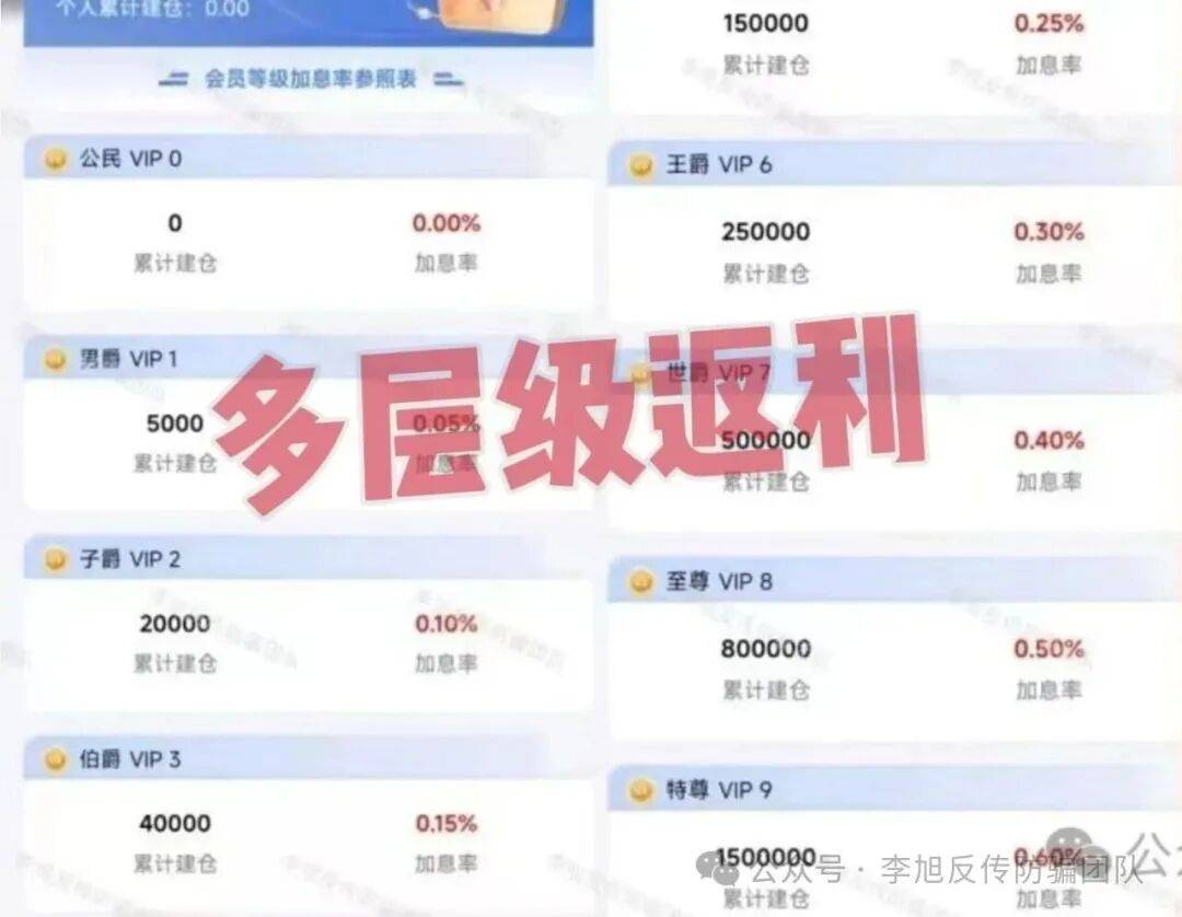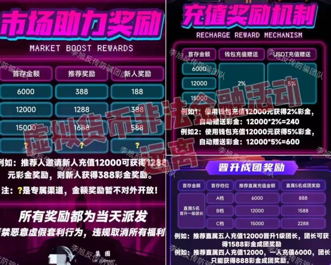 宣称依托境外实体背景,打着“私域流量”的幌子,设置6000-15000元的入门投资档位。承诺每月超30%的固定返利,还配套推荐奖励、晋升团长等多层级激励,要求参与者发展他人加入获取收益。